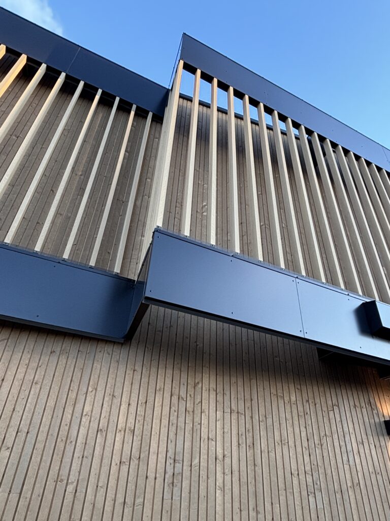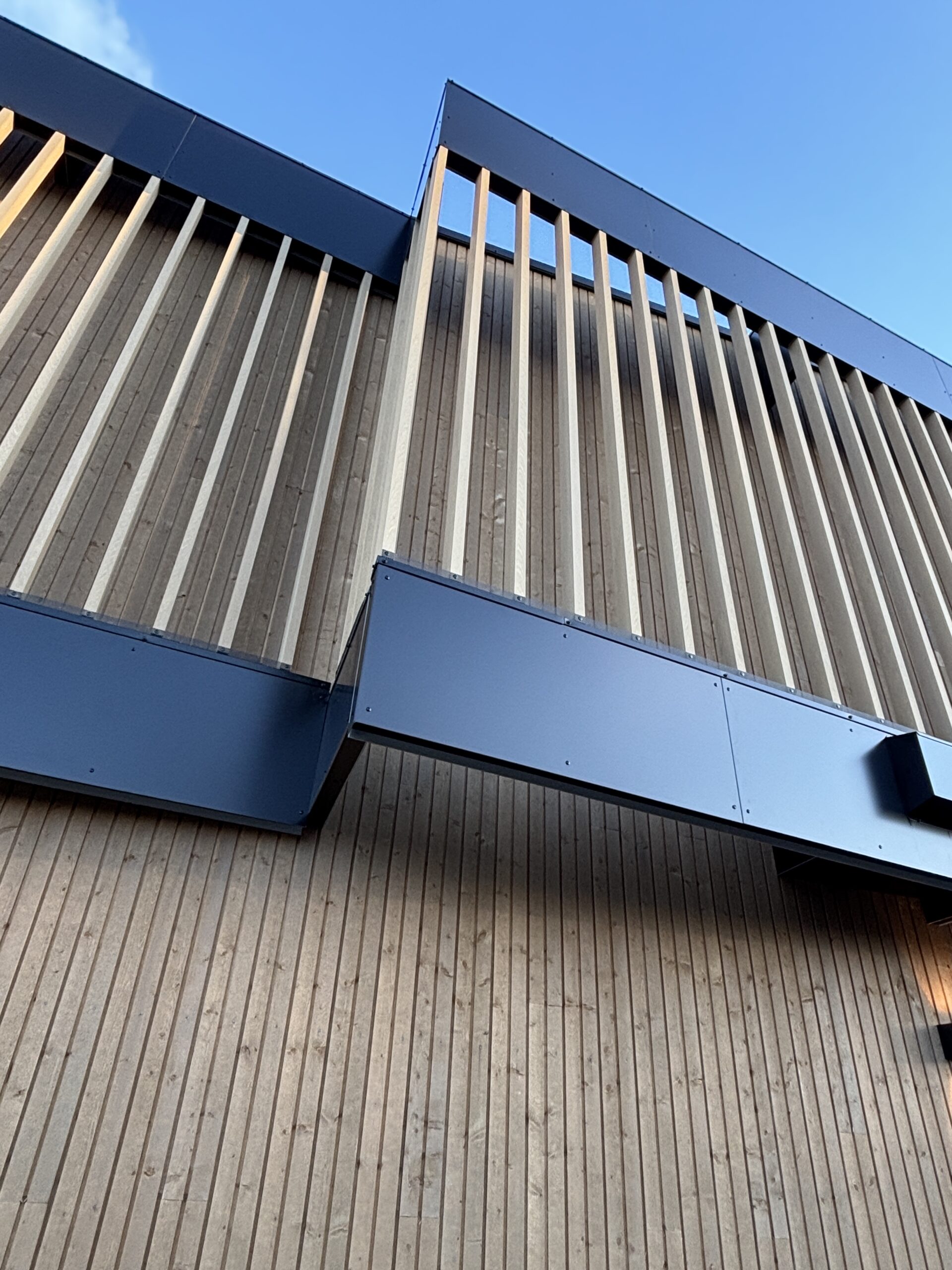 For å skape et sterkt og særpreget fasadeuttrykk er det valgt en kombinasjon av robuste aluminiumskomposittplater og spiler fra Tarimatec: